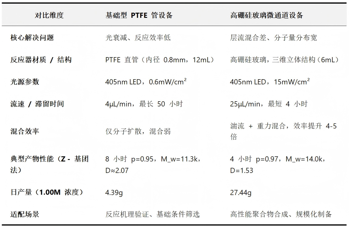 2025 年10月发表于《Macromolecules》,(该期刊由美国化学会(ACS) 主办,是高分子科学领域的国际顶级学术期刊,2025年影响因子(IF)约为6.5-7.0,属于JCR Q1区期刊)。文章的第一作者是苏州大学硕士研究生石震巍,通讯作者是苏州大学朱健教授和李佳佳副教授,苏州大学石震巍、李佳佳、朱健团队首次实现光引发 RAFT 逐步增长聚合的连续流体系,通过在线链延伸模块无需中间纯化即可合成接枝、多嵌段共聚物;交替尖刺结构高硼硅玻璃反应器解决层流混合问题,提升光穿透性与传质效率,实现更高转化率、分子量及更窄分散度。浙江布瑞利斯为该研究提供了连续流光反应器设备支持。 一 研究背景 过去十年,光化学与连续流技术结合在 RAFT 链增长聚合中已获进展,如 2015 年 Chen 等实现石英管反应器中光 RAFT 聚合,60 分钟内乙烯基单体转化率达 80%,远快于批次反应的 240 分钟;但在 RAFT 逐步增长聚合中应用极少。逐步增长聚合本身面临长反应时间、副反应多(阻碍高分子量产物生成)等挑战,现有连续流研究多集中于共轭聚合物、聚氨酯等,光引发 RAFT 逐步增长聚合的连续流体系尚未被探索。 二 基础型 PTFE 管连续流光化学设备 该设备为研究初期搭建的核心反应系统,主要用于验证连续流对光引发 RAFT 反应的加速效果,是后续设备优化的基础原型。 (一)核心结构与组件 采用具备耐化学腐蚀、透光性适配 405nm 光源的特点的聚四氟乙烯(PTFE)微管作为反应通道,且内壁光滑可减少反应物吸附,保证反应体系稳定性。采用柱塞泵精准控制流体流速,基础实验中固定为4μL/min,通过调节流速可灵活改变反应物滞留时间。整体设备通过风扇风冷维持反应温度恒定在 25℃,避免光反应放热导致的局部温度升高,减少 RAFT 试剂热分解风险。反应前通过氩气吹扫 PTFE 管 10 分钟,同时对反应混合物进行脱氧处理,消除氧气对自由基聚合的抑制作用,确保 RAFT 反应高效启动。 (二)关键性能数据 在 RAFT-SUMI 模型反应中,批次反应需 72 小时达到反应程度 p=0.74,而该设备仅需 12 小时;延长滞留时间至 48 小时,p 可提升至 0.86,超过批次反应平台值,证明其能突破批次反应的转化率瓶颈。 在 A₂+B₂型 RAFT 逐步增长聚合中,设备实现 8 小时内 p=0.95,日产量达 4.39g,而批次反应需 24 小时,反应时间缩短 67%,生产效率提升 3 倍。 浙江布瑞利斯化工改进型高硼硅玻璃 微通道连续流光化学设备 (一)核心结构与创新设计 反应器主体:三维立体(交替尖刺)结构微通道 材质升级为高硼硅玻璃,相比 PTFE 具备更高透光率(405nm 波长透光率≥92%,PTFE 为 85%),进一步提升光利用效率;同时玻璃材质可通过激光雕刻工艺加工复杂通道结构,是实现混合优化的关键。 通道设计为三维立体结构,单通道直径仍为 0.8mm(与 PTFE 管一致,保证光程不变),最大滞留体积 6mL;尖刺结构每隔 1cm 设置一个 “凸起 - 凹陷” 单元,当流体流经时产生局部湍流,同时弯曲路径利用重力促进上下层流体交换,混合效率较直管提升 4-5 倍。 光源替换为高功率 405nm LED,光强提升至 15mW/cm²(为基础设备的 25 倍),配合高硼硅玻璃的高透光性,可在短滞留时间内实现 RAFT 试剂高效激活,同时避免局部过热(因通道体积减小至 6mL,散热更易控制)。温控模块升级为循环恒温泵,通过玻璃反应器底部的恒温夹套实现 25℃精准控温(温度波动≤±0.5℃),适配高功率光源下的放热反应,稳定性优于基础设备的风扇风冷。新增背压调节,将系统压力稳定在 0.2MPa,避免高流速下流体沸腾(尤其在反应后期聚合物溶液粘度升高时),同时确保流体在通道中填满所有微结构,无死体积残留。 ![]() 左图:布瑞利斯板式微通道光聚合反应器 右图:内部通道结构 (图片来源文章支持文件) (二)功能优势与性能突破 三维立体结构打破层流 “平行流动” 状态,通过湍流与重力混合,使增长的寡聚物链端能充分碰撞,减少因混合不足导致的 “链增长不均”,聚合物分散度显著降低。 高硼硅玻璃的高透光性 + 高功率 LED,使光强在通道内分布更均匀,RAFT 试剂激活效率提升,反应程度(p)更快达到高位,且避免局部过激活导致的副反应。 四 两类设备的对比与适配场景 ![]() 总结 浙江布瑞利斯连续流光化学设备通过 “基础型 PTFE 管系统” 与 “改进型高硼硅玻璃微通道系统” 的阶梯式设计,精准解决了光引发 RAFT 逐步增长聚合中的光衰减、混合不足、规模化难等核心问题。在实验验证中,设备不仅实现反应时间缩短 67%、日产量提升 6.25 倍,更支持复杂结构共聚物的连续合成,为《Flow RAFT Step-Growth Polymerization》研究成果的工业化转化提供关键装备支撑,同时为功能高分子材料的高效、绿色合成开辟新路径,具备显著的学术价值与产业应用潜力。 布瑞利斯光化学设备 ![]() 图 布瑞利斯小试设备--连续光化学板式反应器 ![]() 图:布瑞利斯中试设备--连续光化学反应釜 ![]() 图:布瑞利斯--玻璃微通道反应器 关于我们 ![]() 浙江布瑞利斯是一家专注于流动化学、连续光化学装置研发、工艺开发及技术服务的高新技术企业。公司在杭州余杭区设有1200余平方米的研发展示中心,以及1000余平方米的工艺研发实验基地,并在宁波设有生产总部。公司拥有20余项专利及软件著作权,通过了ISO三体系和欧盟CE认证。主营业务涵盖流动化学、连续光化学实验装置的研发制造,以及小试、中试、放大生产设备的设计和催化剂开发。国内设有7大区域